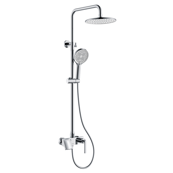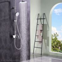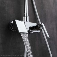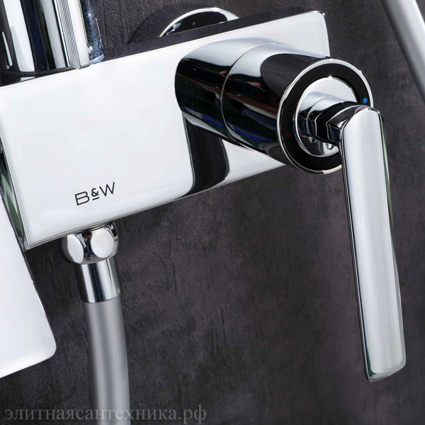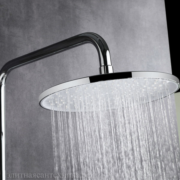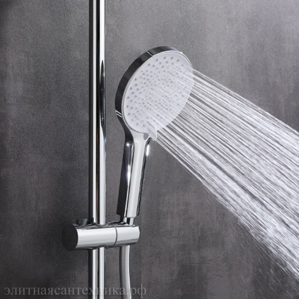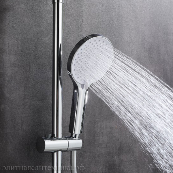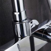 Переключатель (дивертор) между изливом и двумя душевыми лейкам расположен у основания стойки в виде кольца.