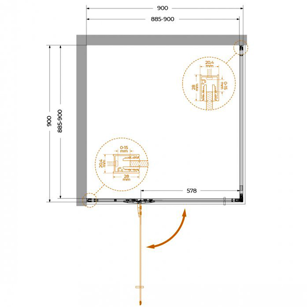 Технические характеристики (размеры в мм): ширина входа 578, регулировка профиля: 885-900