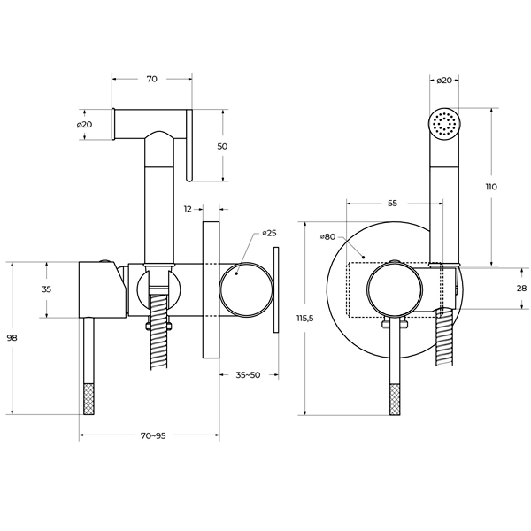 Комплектация: смеситель, лейка из нержавеющей стали, гибкий шланг 120 см, держатель для лейки.