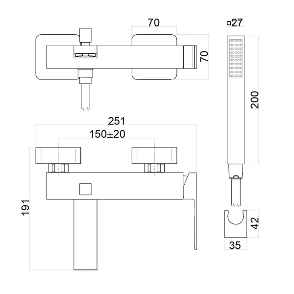 Состав комплекта: смеситель, ручной душ, шланг, держатель.